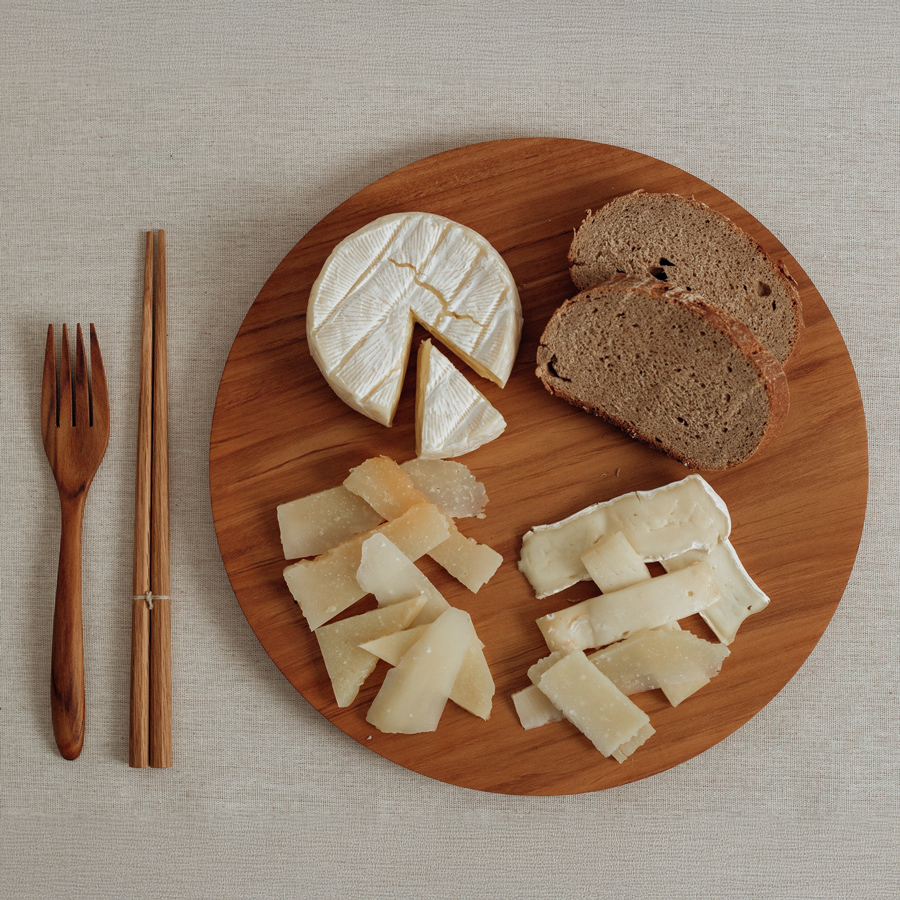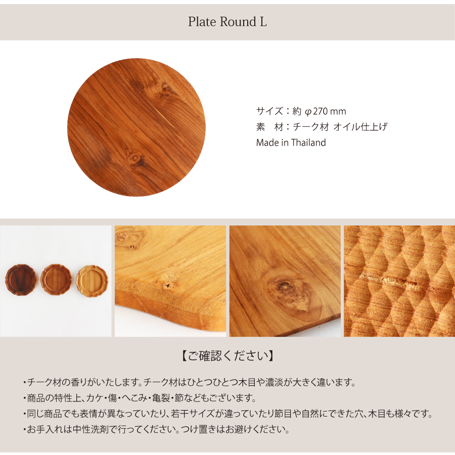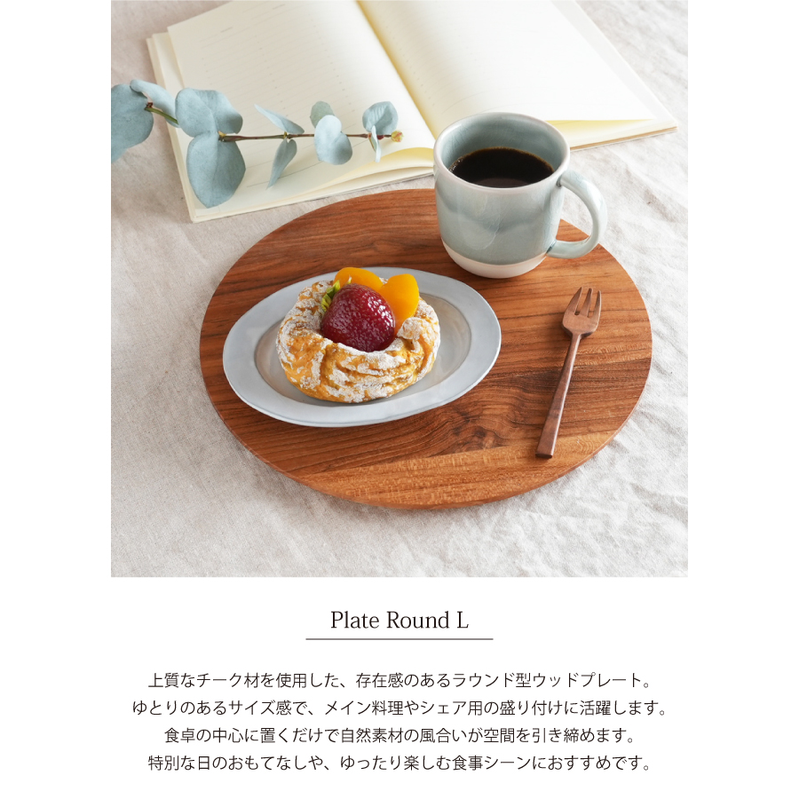 上質なチーク材を使用した、存在感のあるラウンド型ウッドプレート。