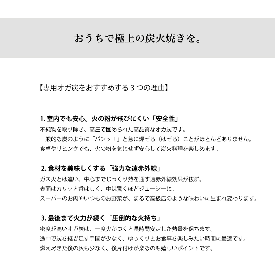 【専用オガ炭をおすすめする3つの理由】