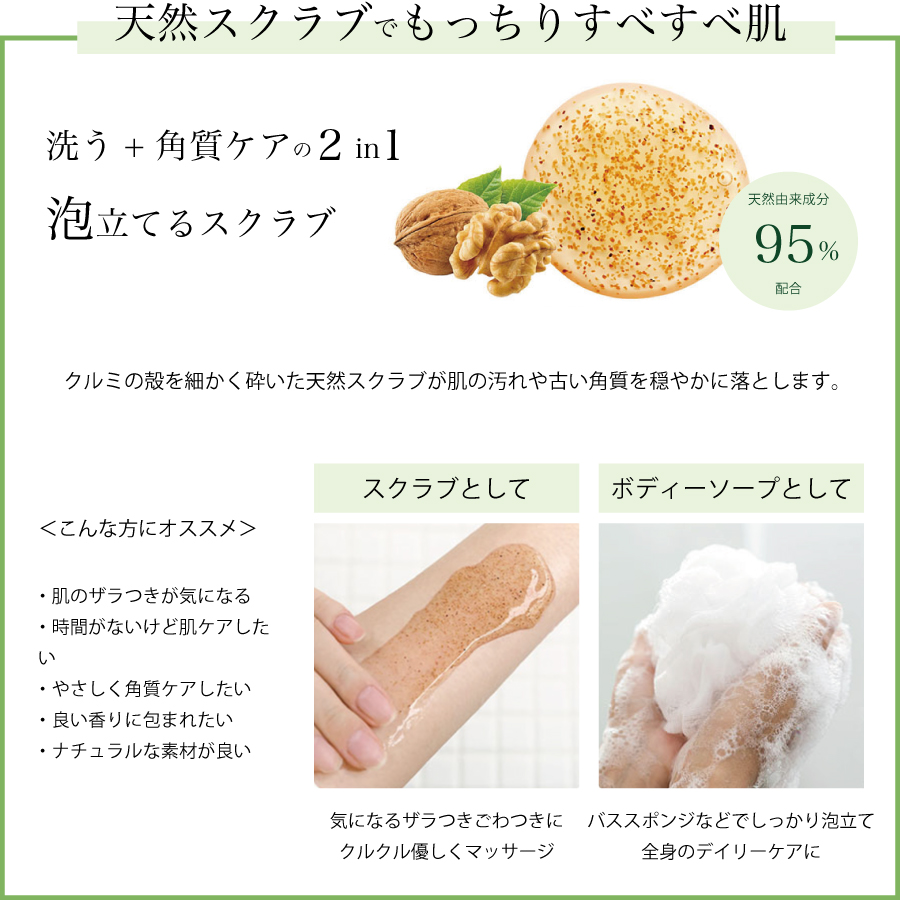 気になる部分には、本品でくるくるマッサージした後、泡立てて洗い、水かぬるま湯で十分に洗い流してください。