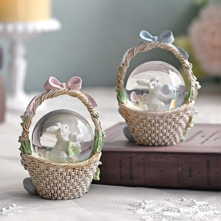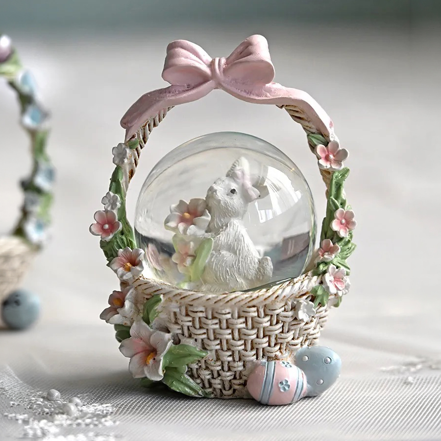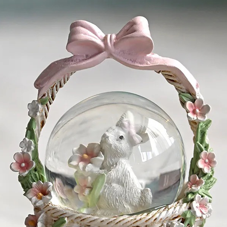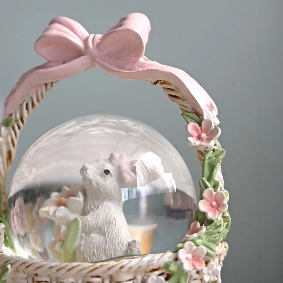 カゴから覗くうさぎが愛らしい、手のひらサイズのスノードーム。