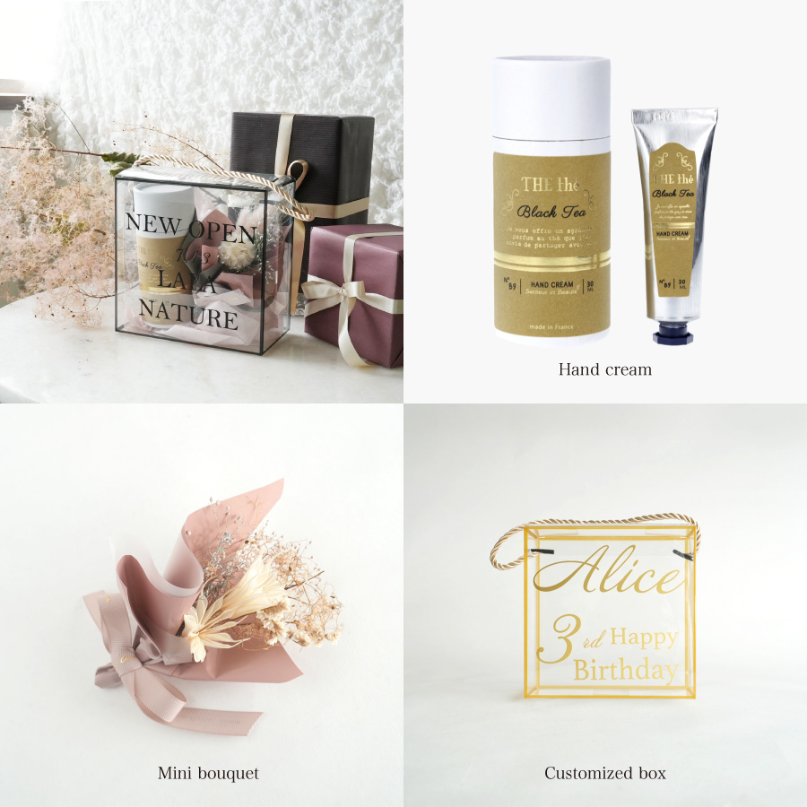 【Gift】ミニブーケボックス Mini Bouquet Box THE theギフトセット 名入れギフト (名入れボックス・ミニブーケ・ハンドクリーム) ザ・ティー [GIFT-MBBOX-T]