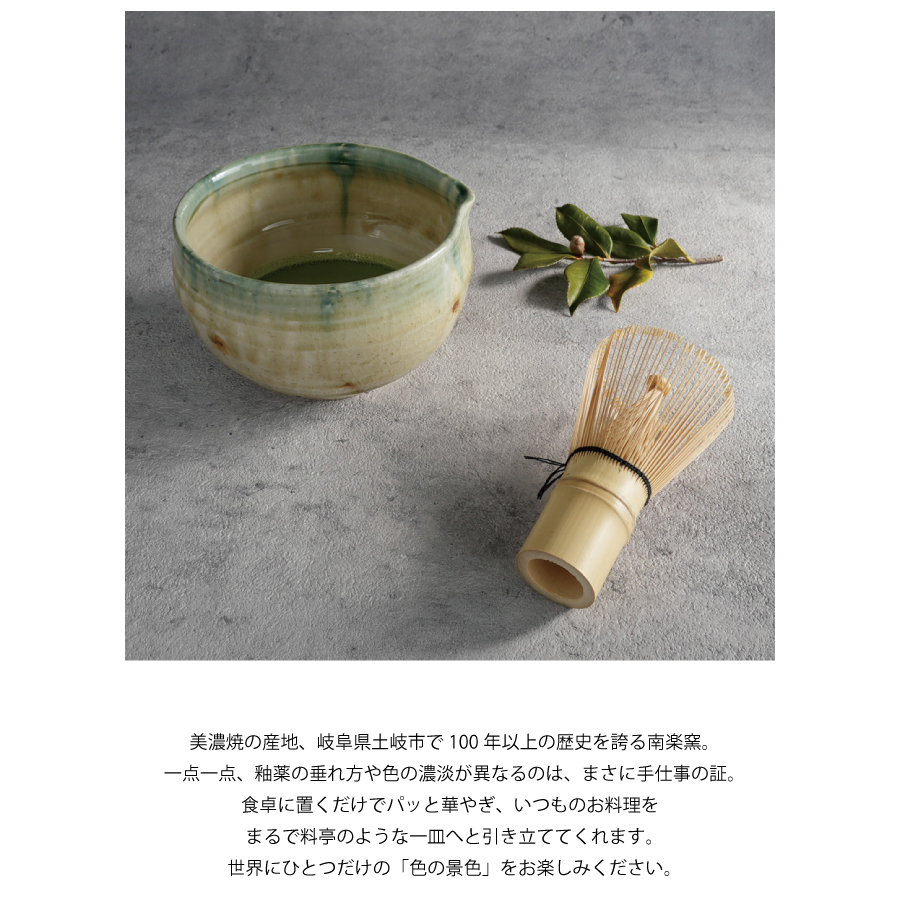 【南楽窯】美濃焼 織部流し 片口抹茶碗 日本製 φ13cm 抹茶オレ [NR-oribe-02]