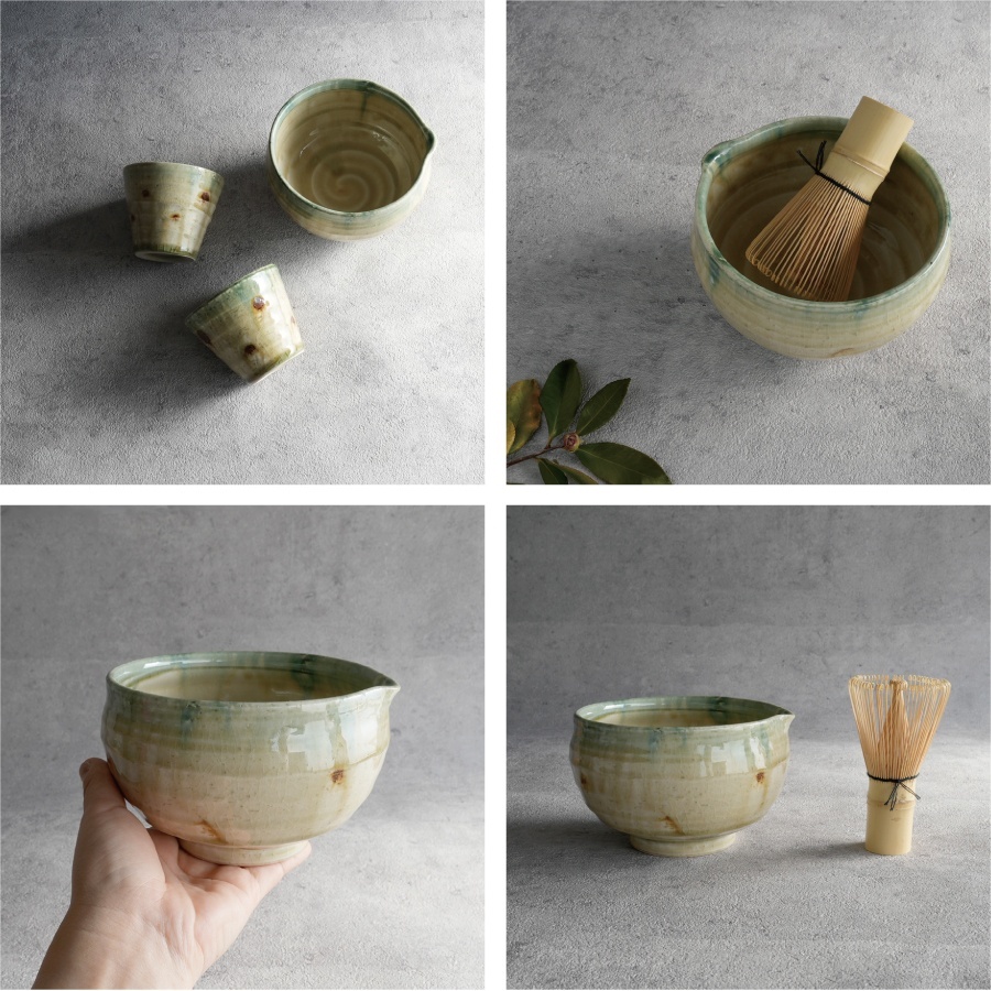 深みのある緑が美しい「織部流し」の湯呑みは、日本茶はもちろん、