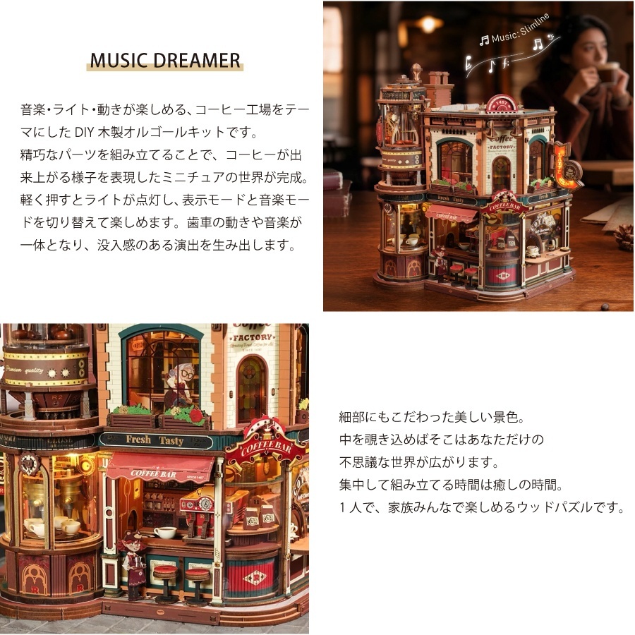 音楽・ライト・動きが楽しめる、コーヒー工場をテーマにしたDIY木製オルゴールキットです。